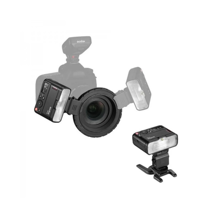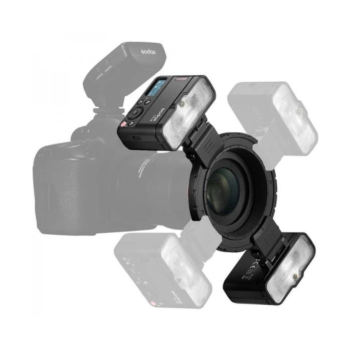 Ngoài ra bộ sản phẩm có kèm bộ điều hợp định vị siêu cận cảnh với cấu trúc dốc được thiết kế đặc biệt, cho phép bạn nghiêng đầu đèn flash vào trong về phía ống kính để chụp ảnh siêu cận cảnh. Để bật/tắt máy ảnh, đầu đèn flash cần có bộ phát được mua riêng và tương thích với Godox XPro, X1, X2 cũng như các bộ kích hoạt đèn flash không dây tùy chọn khác dành cho máy ảnh của các thương hiệu lớn như Nikon, Sony, Canon, Fujifilm, Olympus và Panasonic.